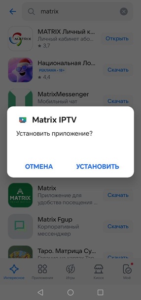 Установка приложения Matrix IPTV из RuStore