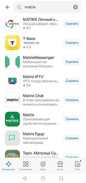 Откройте магазин приложений RuStore в Вашем мобильном устройстве. В поле для поиска напишите Matrix. Рядом с приложением Matrix IPTV нажмите кнопку Скачать.
