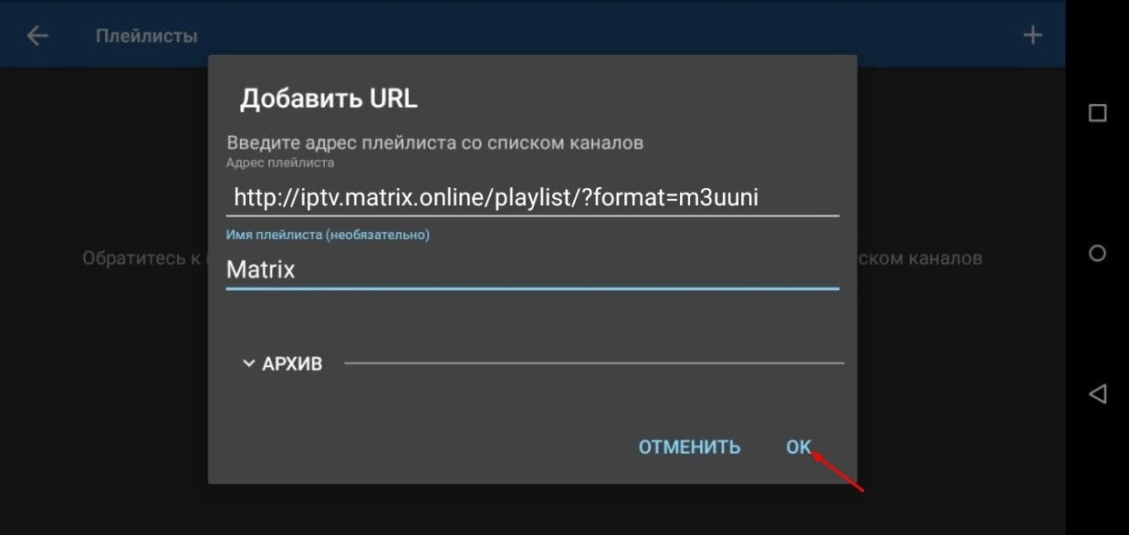 В поле Адрес плейлиста укажите http://iptv.matrix.online/playlist/?format=m3uuni , Имя плейлиста(необязательно)  - Matrix и нажмите OK