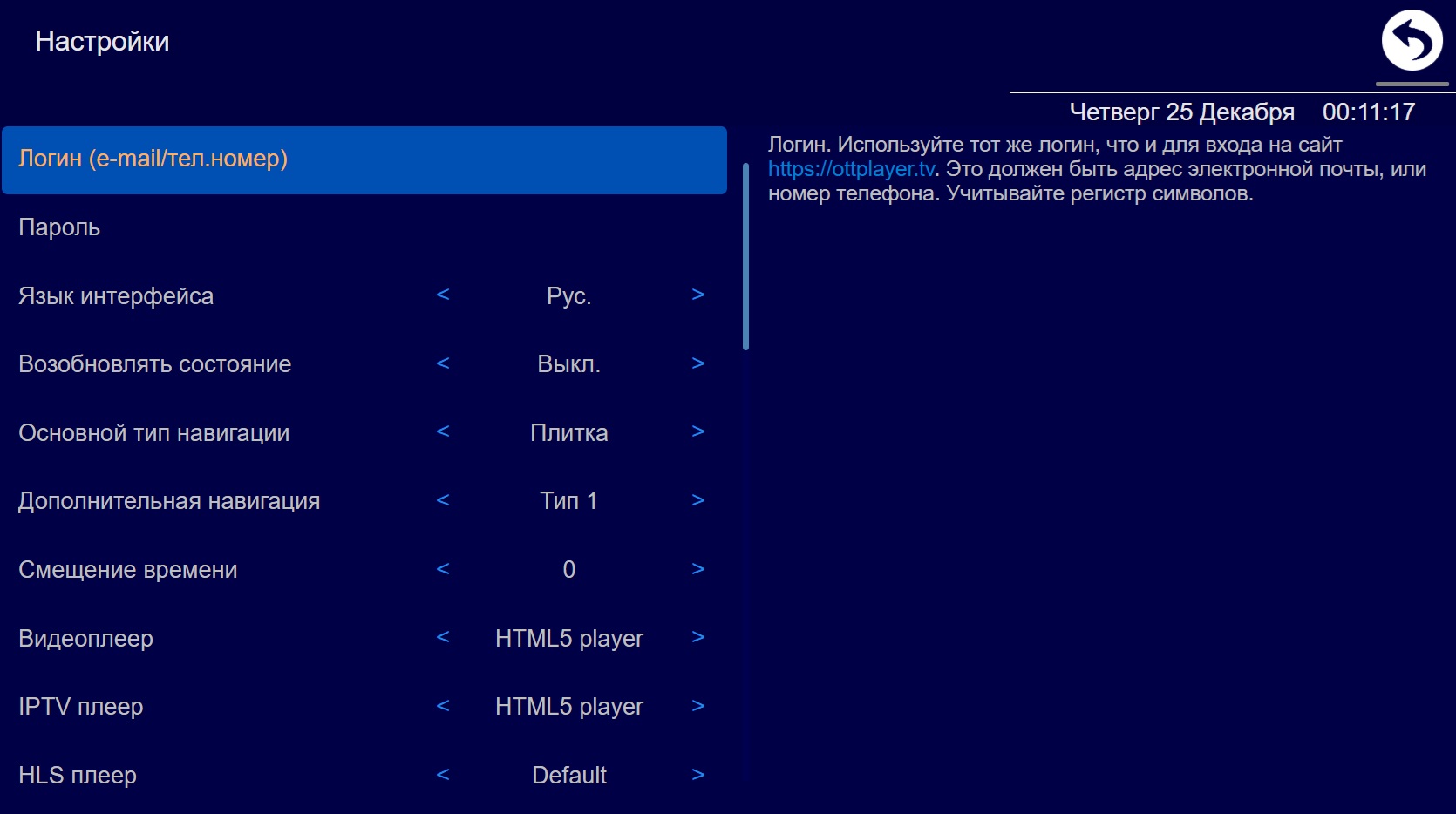 Укажите e-mail и пароль, которые Вы используете для входа на сайт OttPlayer и нажмите Назад.