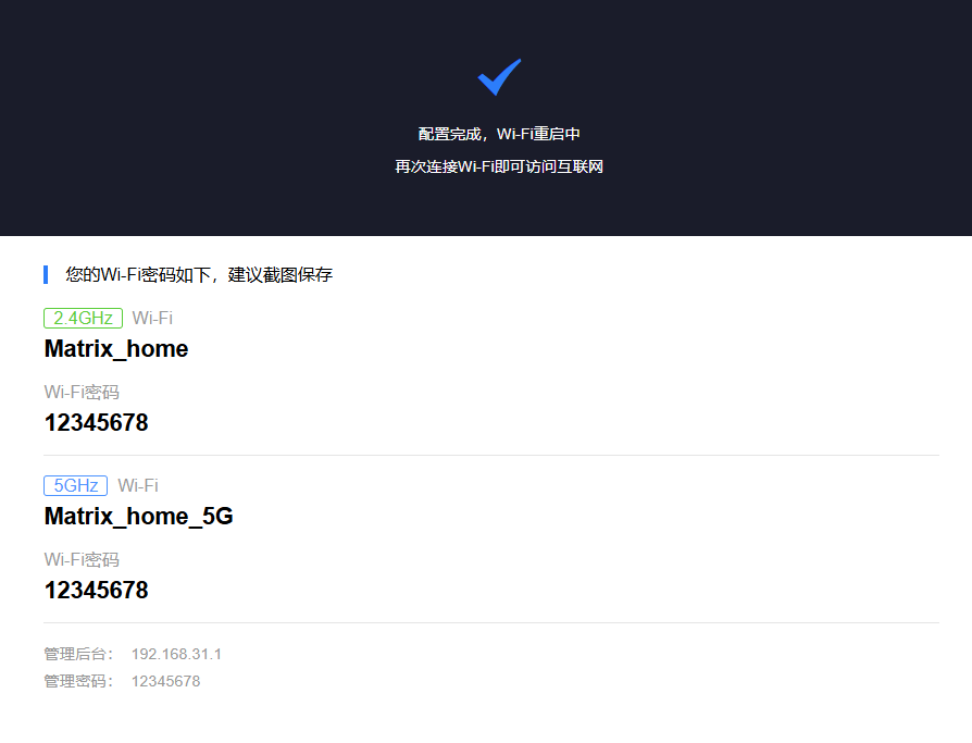 после успешной настройки видим данное окно. Здесь будут заданные параметры от wi-fi сети, а так же адрес, по которому можно менять параметры маршрутизатора.