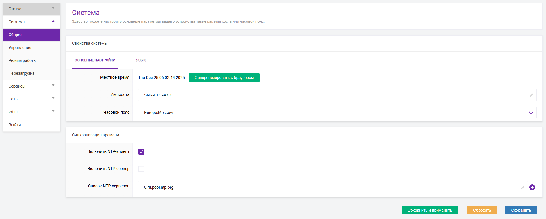 В основных настройках выбираем часовой пояс «Europe/Moscow». Синхронизация времени : включаем NTP-клиент, в «Список NTP-серверов» должно быть «0.ru.pool.ntp.org».