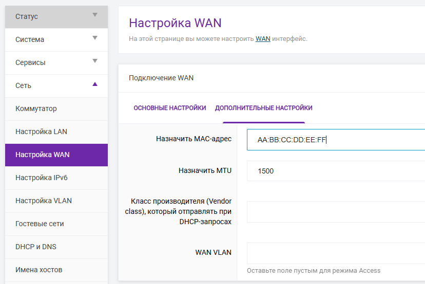 Переходим в пункт «Сеть» → «Настройка WAN». В подразделе «Подключение WAN» выбираем «Дополнительные настройки». Далее в поле «Назначить MAC-адрес» указываем MAC , который хотим задать для роутера.