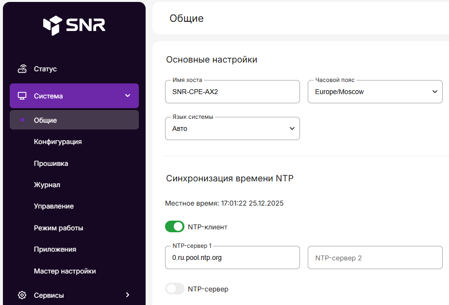 -Проверяем что часовой пояс «Europe/Moscow». Синхронизация времени : включаем NTP-клиент, в «NTP-сервер1» по умолчанию «0.ru.pool.ntp.org».