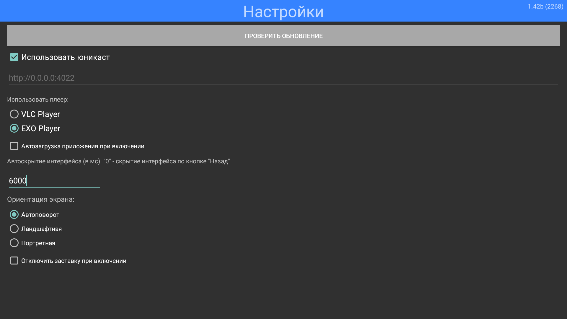 В случае возникновения ошибок воспроизведения или не стабильной работы попробуйте изменить тип плеера на альтернативный, в настройках выберите EXO плеер.