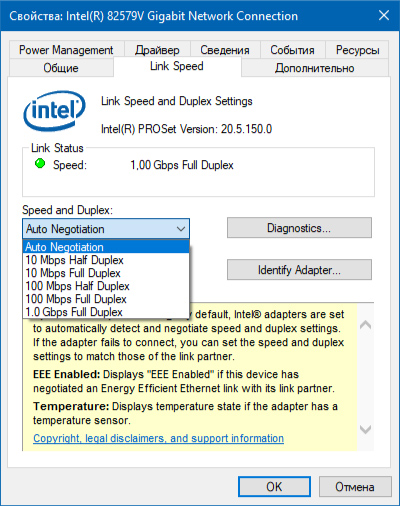 В настоящее время все сетевые карты в основном конфигурируются автоматически, что не требует ручного вмешательства в их настройку. Но в некоторых случаях неумелые действия пользователя, в попытках повысить производительность сети, наоборот могут привести к ухудшению ее работы. Например, пользователь заметил, что есть опция “Скорость соединения”, которая установлена в режим “Автосогласование”, но при этом имеет привлекательные значения, такие как 100 Мбит/с или 1 Гбит/с.
